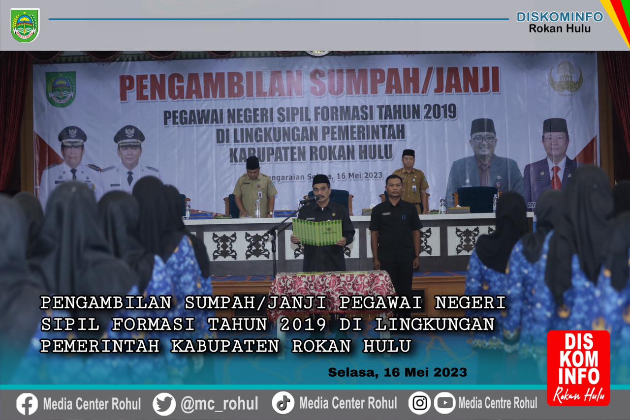 MEDIA CENTER ROHUL- Bupati Rokan Hulu (Rohul) diwakili asisten bidang administrasi Umum Edi Suherman, SH mengambil Sumpah/Janji 169 Calon Pegawai Negeri Sipil (CPNS) Formasi Tahun 2019 di lingkungan Pemerintah Kabupaten Rohul yang dilaksanakan di Convention Hall Islamic Center Rohul, Selasa (16/05/2023).