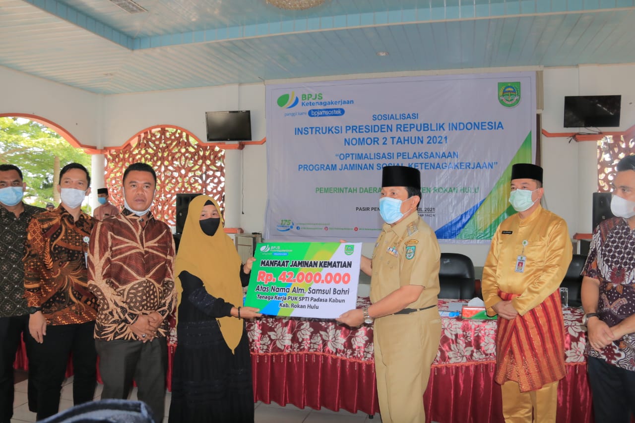 Media Center Rohul- Bupati Rokan Hulu H.Sukiman Buka Secara Resmi Sosialisasi instruksi presiden RI no 2 th 2021 dengan tema " Optimalisasi Pelaksanaan Program Jaminan Sosial Ketenagakerjaan", Jumat (9/4/2021) bertempat di Pendopo Rumah Dinas Bupati, Desa Pematang Berangan, Kec.Rambah, Kab.Rokan Hulu.