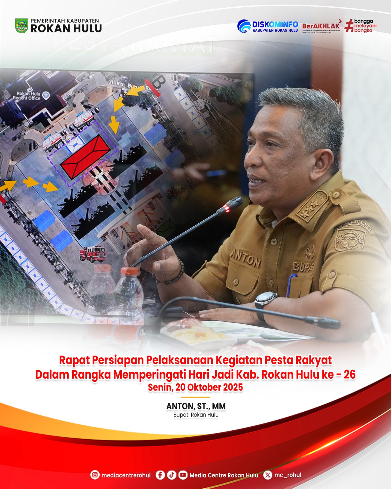 Rohul | mediacenterrohul.com – Menjelang pelaksanaan malam puncak pesta rakyat dalam rangka Hari Jadi Kabupaten Rokan Hulu (Rohul) ke-26 tahun yang berlangsung pada tanggal 25 nanti, Bupati Rohul Anton, ST, MM memimpin rapat finalisasi persiapan di Ruang rapat Rumah Dinas Bupati, Senin (20/10/2025).