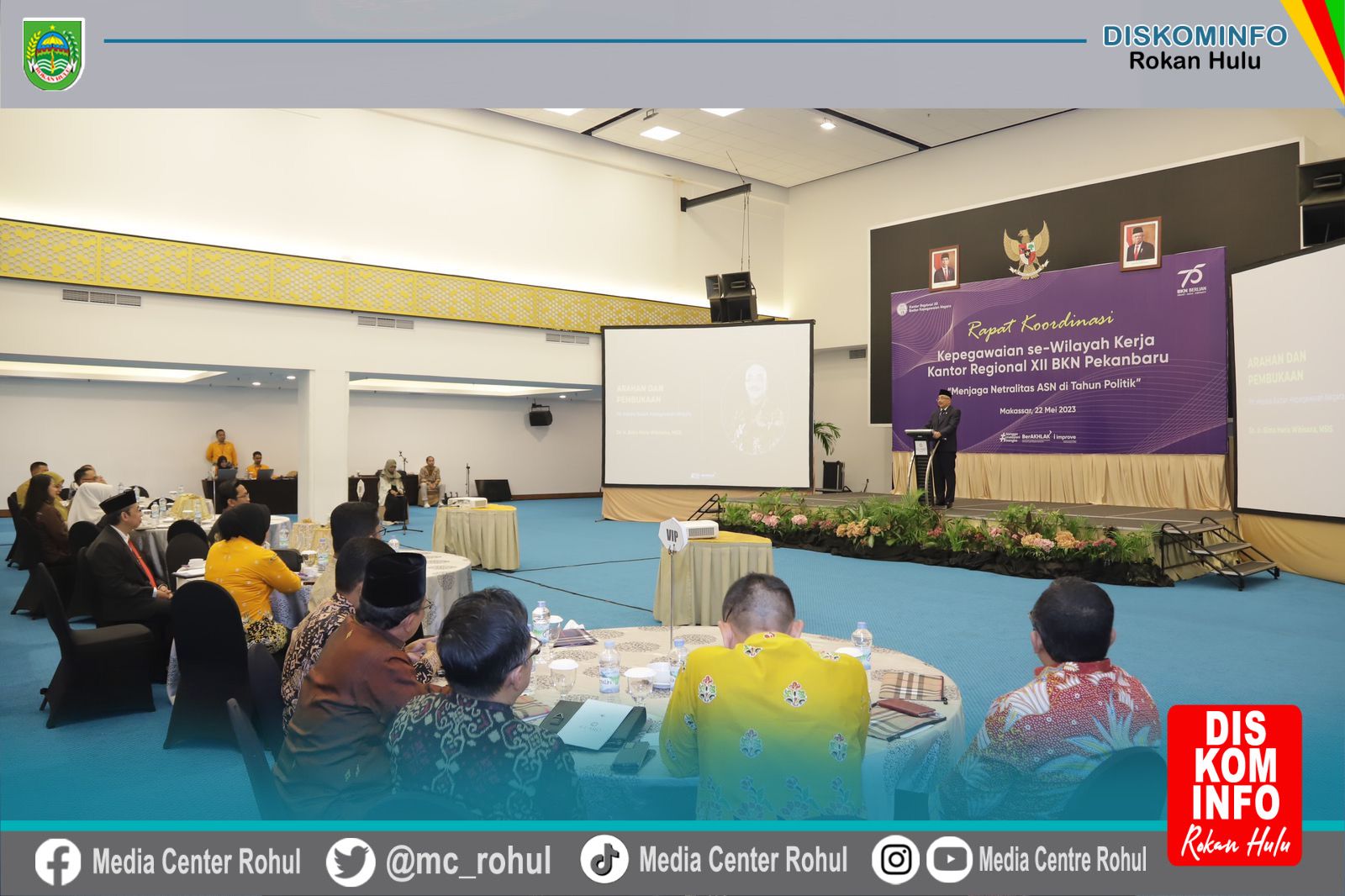MEDIA CENTER ROHUL - Bupati Rokan Hulu (Rohul) H.Sukiman diwakili Sekretaris Daerah (Sekda) Rohul Muhammad.Zaki S.STP,M.Si menghadiri Rapat Koordinasi (Rakor) Kepegawaian se-Wilayah Kerja Kantor Regional XII BKN Pekanbaru senin (22/05/2023) di Ballroom Hotel Claro Makassar. Dengan tema "Menjaga Netralitas ASN di Tahun Politik"