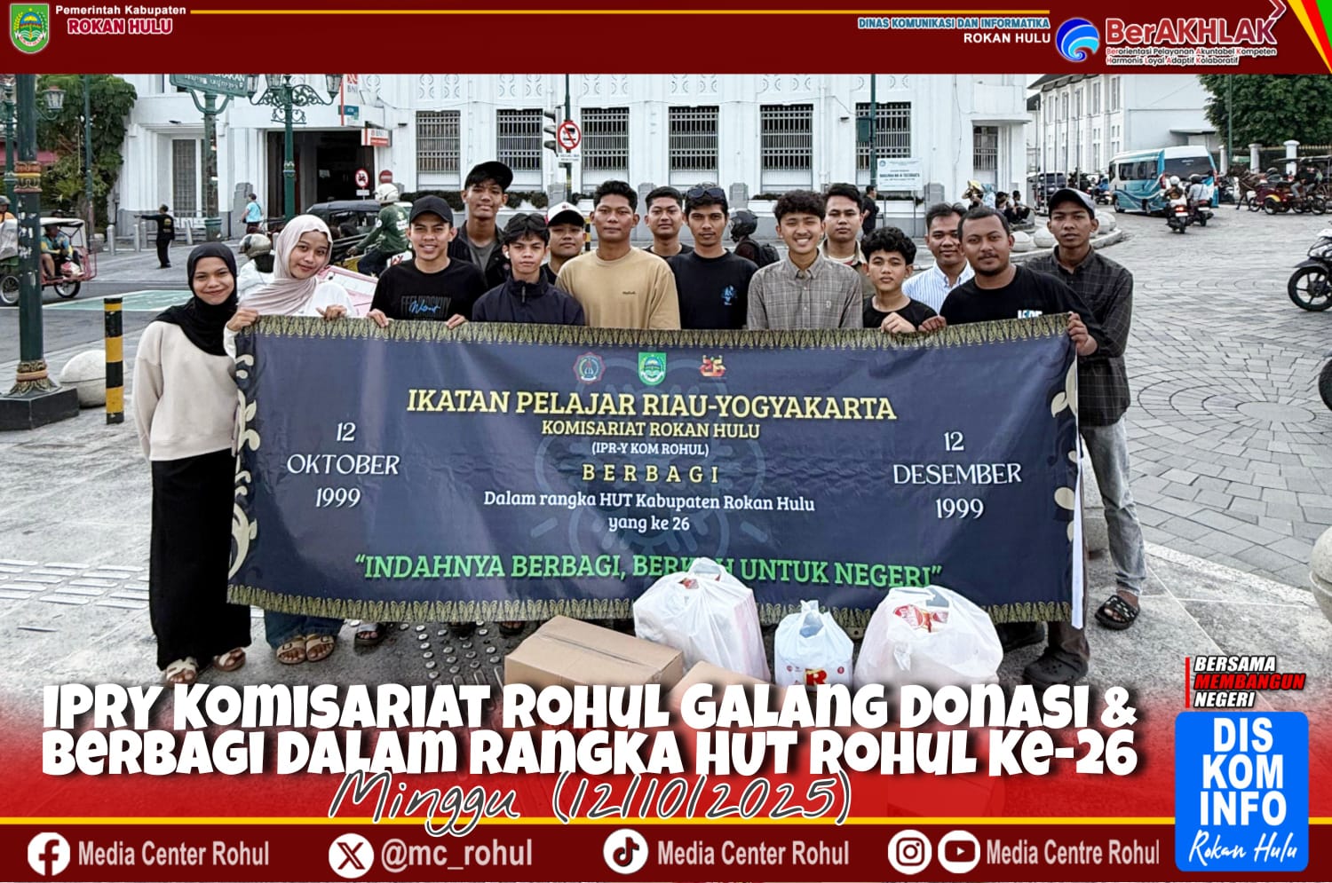 Media Center Rohul— Dalam rangka memperingati Hari Jadi Kabupaten Rokan Hulu (Rohul) Ke-26, Ikatan Pelajar Riau Yogyakarta (IPRY) Komisariat Rokan Hulu (Rohul) bekerja sama dengan Lembaga Asrama Tuanku Tambusai menggelar kegiatan sosial berupa pembagian nasi kotak kepada para penarik becak di sekitaran Titik Nol Kilometer Yogyakarta, Minggu (12/10/2025).