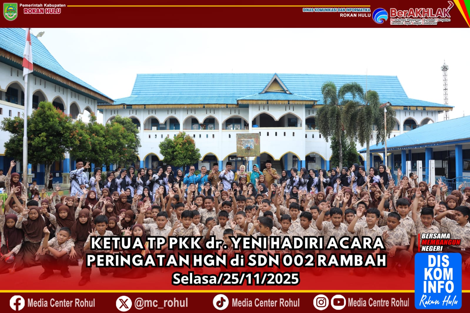 Media Center Rohul - Ketua TP PKK Kab. Rokan Hulu dr. Yeni Dwi Putri hadiri acara peringatan Hari Guru Nasional (HGN) Tahun 2025 di SDN 002 Rambah, Pasir Pengaraian, Selasa (25/11/2025)