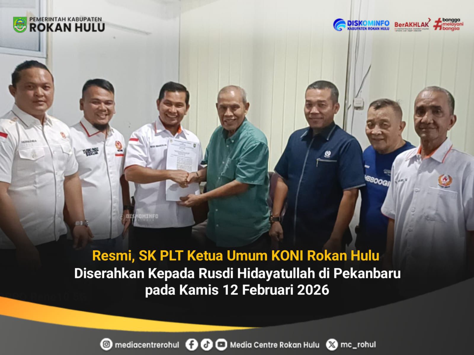 Media Center Rohul - Ketua Umum KONI Riau H. Iskandar Hoesin menyerahkan SK Plt. Ketua Umum KONI Rokan Hulu kepada Rusdi Hidayatullah di Pekanbaru (12/02/2026), menandai dimulainya upaya konsolidasi organisasi.