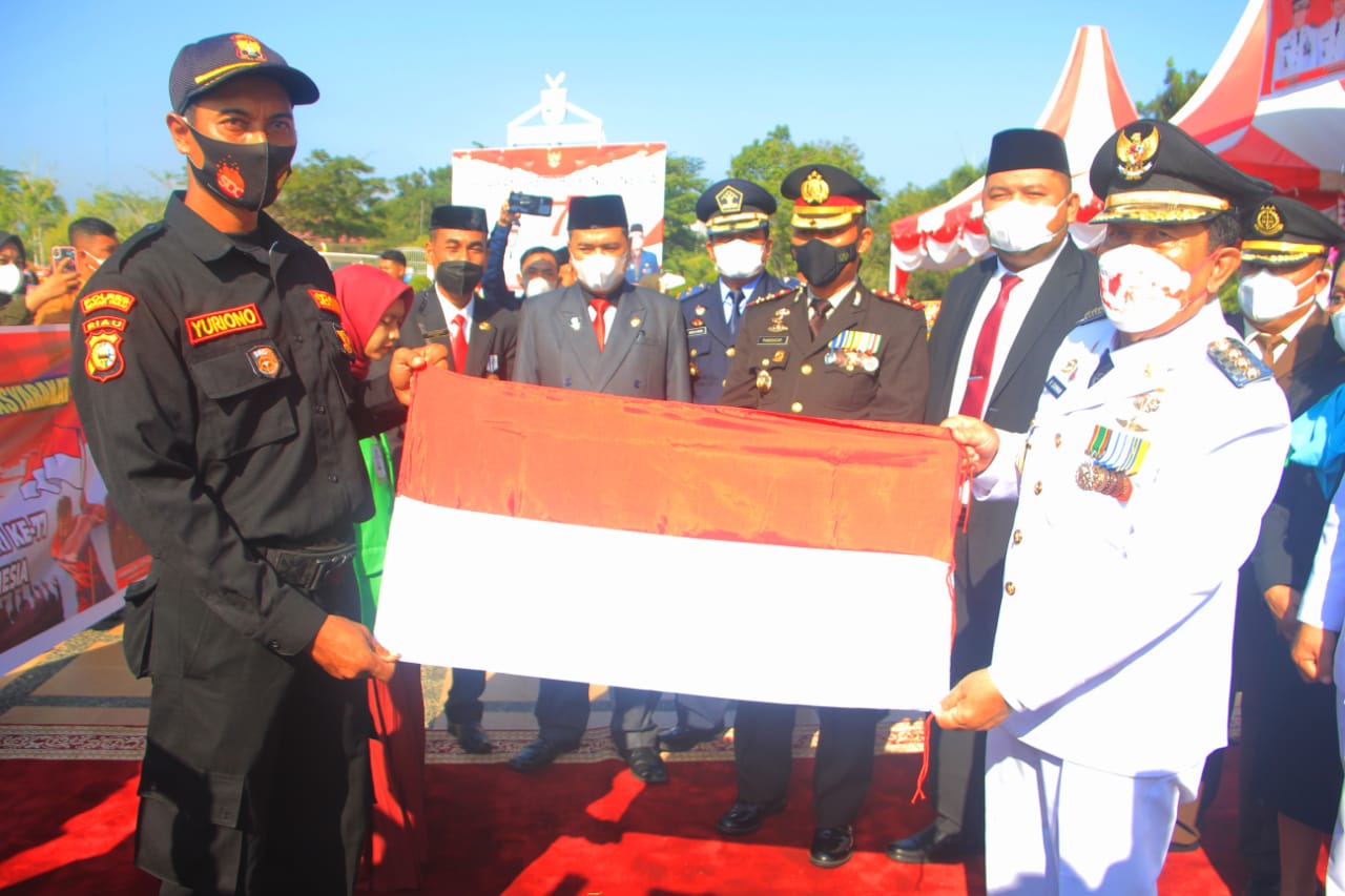 Pasir Pengaraian - Disela-sela rangkaian kegiatan upacara bendera dalam rangka Peringatan HUT Ke 77 Republik Indonesia ( RI), Bupati Rohul H. Sukiman membagikan sebanyak 10 ribu Bendera Merah Putih kepada sejumlah Ormas, Lembaga Pendidikan dan Pemerintah, di Halaman Kantor Bupati Rokan Hulu, Rabu (17/8/2022).