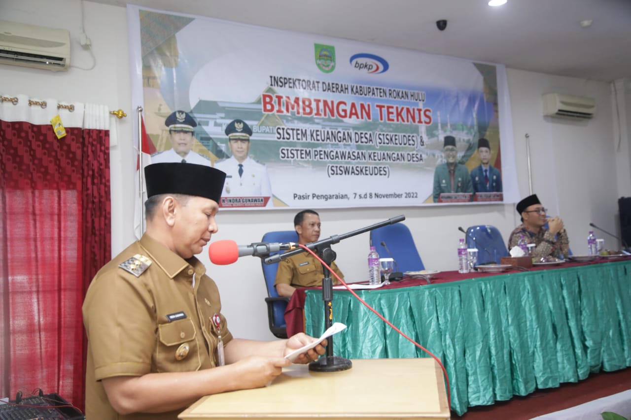 Pembukaan bimbingan teknis siskeudes online dan siswaskeudes tahun 2022 ini dilaksanakan di Sapadia Hotel Pasir Pengaraian, Senin (7/11/2022) yang turut dihadiri juga oleh kepala BPKP perwakilan Riau, Inspektur Inspektorat Rohul, H Helfiskar, SH MH, para staf ahli Bupati, para bendahara DESA, se Kabupaten Rokan Hulu.