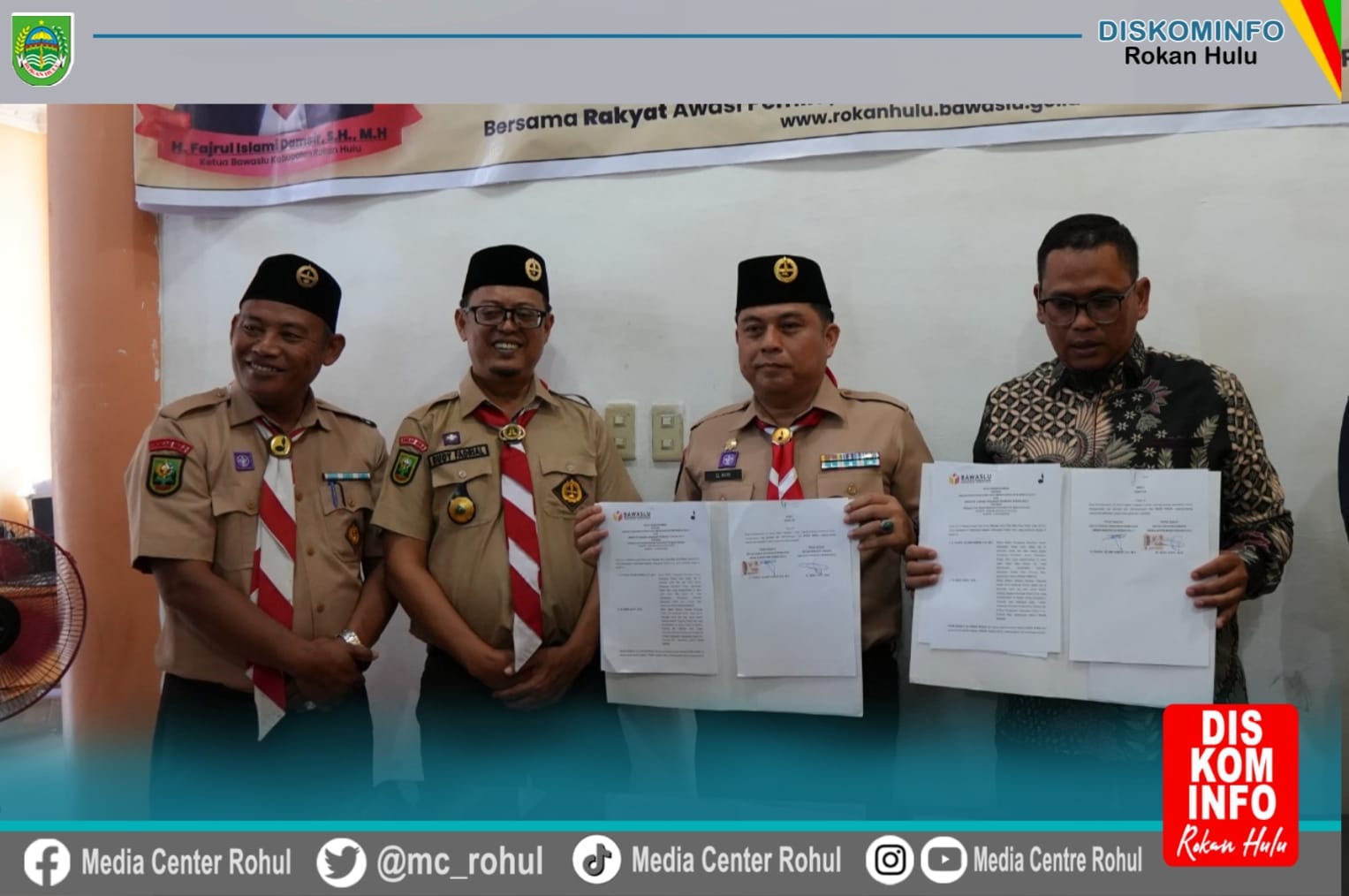 Media Center Rohul - Dalam upaya memperkuat sinergi dan memperluas jaringan pengawasan partisipatif, Badan Pengawas Pemilihan Umum ( Bawaslu) Kabupaten Rokan Hulu menandatangani nota kesepahaman (MoU) dengan Kwartir Cabang (Kwarcab) Gerakan Pramuka Rokan Hulu.